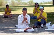 杨青和其他法轮功学员在布朗斯维克市的眺望公园(Overlook Park)打坐炼功。一组法轮功学员来到布朗斯维克市,呼吁报道八国峰会的媒体关注他们在中国持续受到的迫害。杨青身穿受害者的服饰,演示法轮功学员受到中国政府的酷刑折磨。