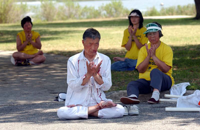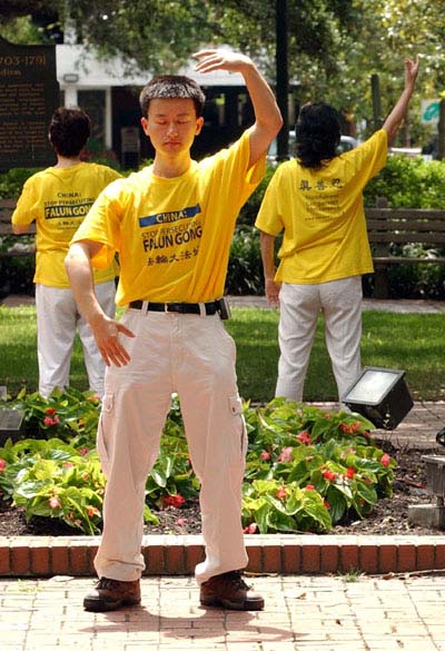 包括打坐、炼功的平和的自我修炼功法法轮功在中国受到禁止。来自密执根州底特律的提姆-孙(Tim Sun)在乔州萨瓦纳市中心的雷诺广场炼功。法轮功在八国峰会期间希望人们关注发生在中国的对法轮功学员的迫害。