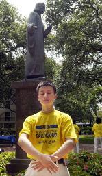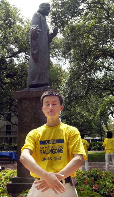 来自密执根州底特律的提姆-孙(Tim Sun)在一塑雕像前炼功。法轮功在八国峰会期间希望人们关注发生在中国的对法轮功学员的迫害。