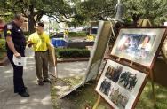 法轮功学员们在乔州萨瓦纳市中心的雷诺广场炼功。他们展示图片希望人们关注在中国的迫害。中国的法轮功学员因为他们的信仰而受到折磨,被关進监狱,有的被强迫做奴工。来自佛州的凯文-杜向萨瓦纳警察局的警官凯罗(Anthony Gallo)说明真象。