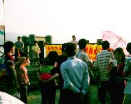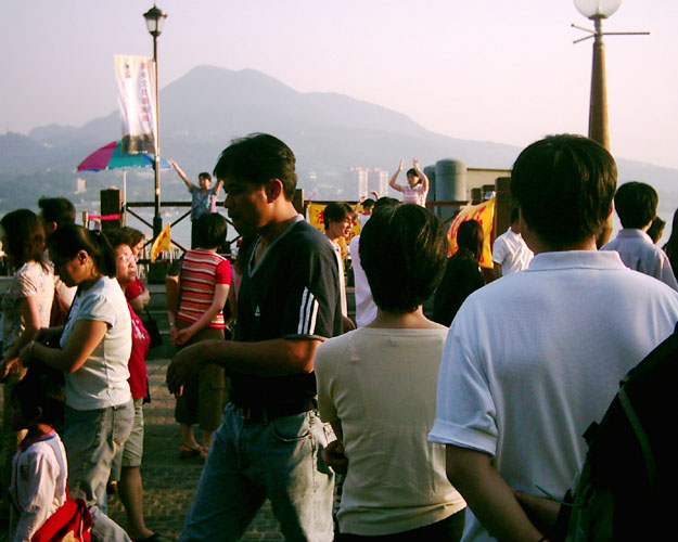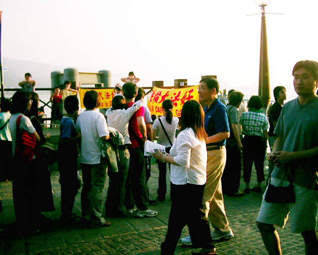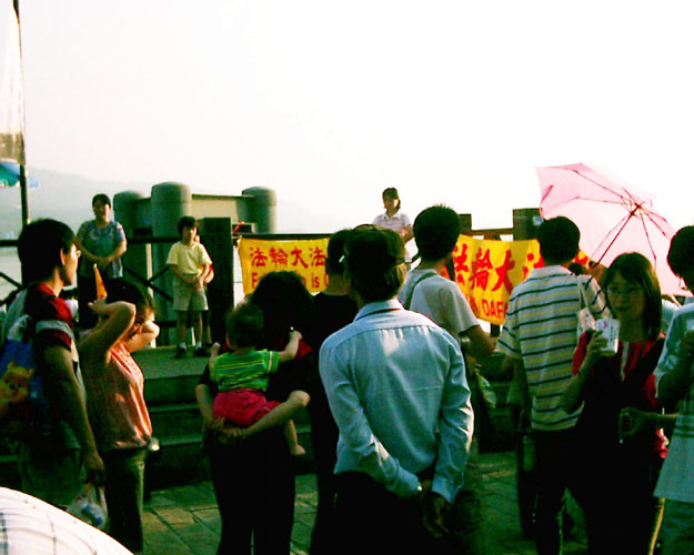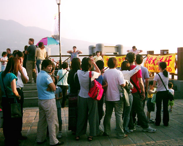 当祥和的炼功音乐响起时,这“淡水码头”如同为法轮功而设的天然舞台,旁边排了两排很长等候搭乘渡轮的人们,以及游逛商店的旅客,都循声驻足观看法轮功学员优美的功法演示。