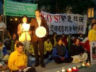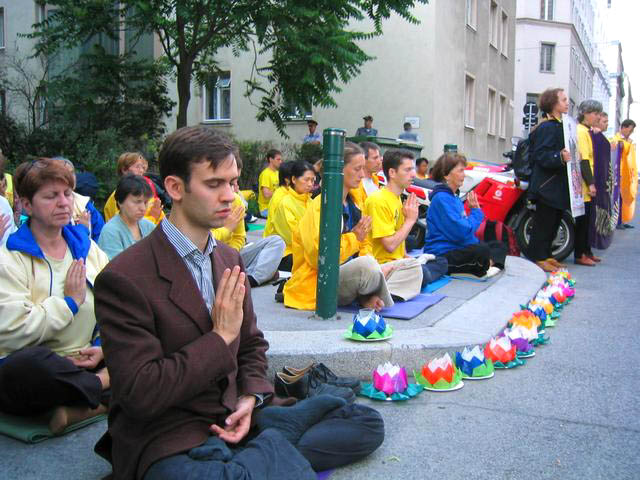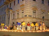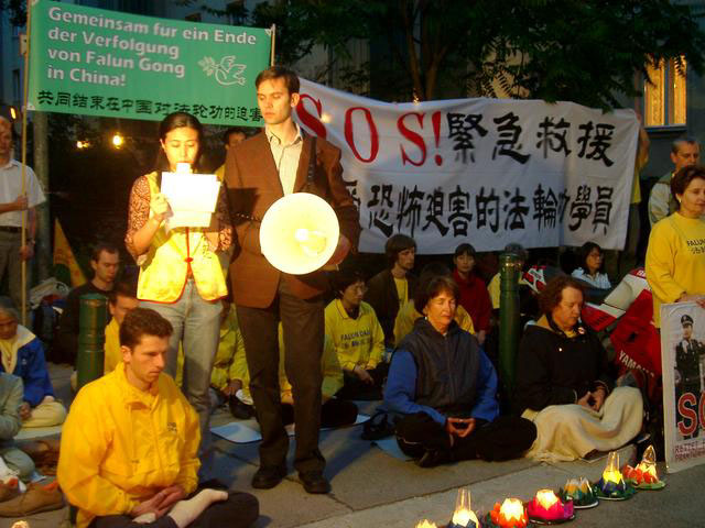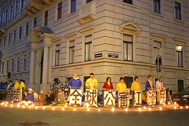 2004年6月18日,欧亚多国法轮功学员汇集在维也纳中国驻奥地利使馆前,为悼念在中国被迫害致死的法轮功学员举行烛光守夜,呼吁停止迫害,希望中使馆的全体工作人员维护善良,选择正义。