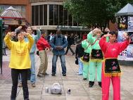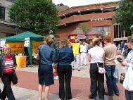 法轮功学员们搭起了一个大帐篷,并悬挂黄底红字写有中英文“法轮大法”、“真善忍”的横幅,祥和的集体炼功和优美平和的音乐吸引了很多路人观看。有许多人询问这是什么,还有一些人马上记下了当地炼功点的地址,表示要来学功。很多人听完真象后,都愿意签名支持法轮功。还有些人甚至留下自己的地址,希望学员给他们寄去更详细的真象材料。