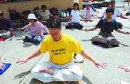 周末两小时的集体炼功首先是炼“佛展千手法。”波尔曼教大家两脚与肩同宽站立、膝盖微曲、嘴唇微闭、面带祥和。大家慢慢的将手臂伸向不同方位并抻展身体。波尔曼说,第一套功法的目地是打开身体的脉络。