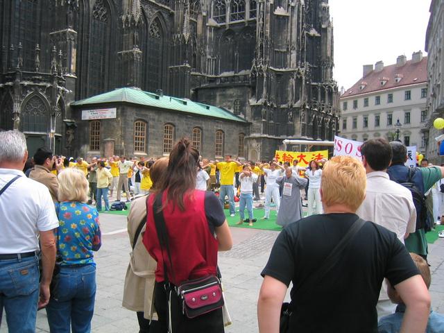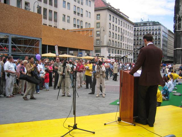 学员们通过向市民和游客讲真象、表演功法、展示酷刑展和演奏乐曲等呼吁全社会帮助停止对法轮功学员的迫害。奥地利国会人权委员会主席斯多尔西特到场演讲表示支持。