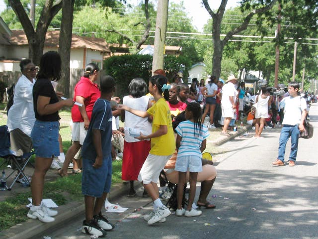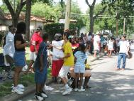 有位六岁的小弟子从头到尾走过来,炎热的天气使得她的小脸红红的,这位小弟子的左边胳膊绑着绷带,一路上用右边胳膊专注的给人们发着材料,而她的姐姐为了向更多的人们散发材料,把原来装有食物的背包腾空,放上大法真象材料,只留了一瓶水在身上,这些孩子们的纯朴的心感动了许多观众。