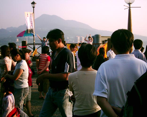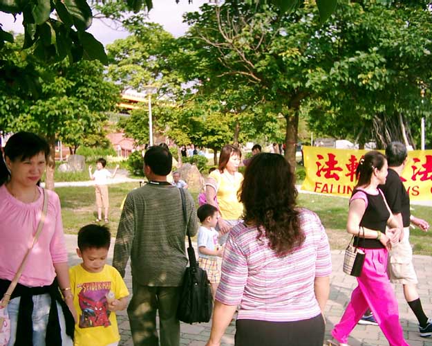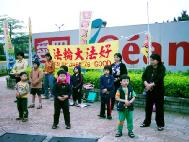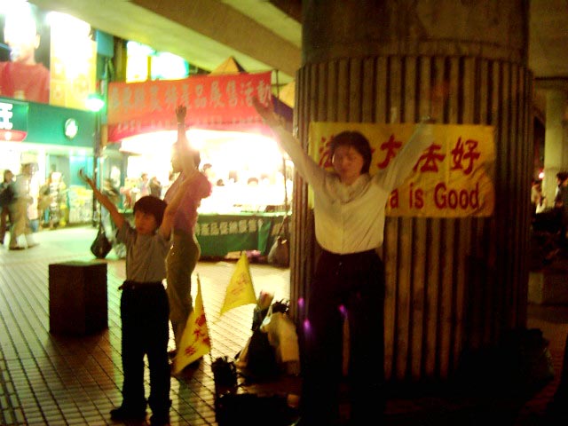 我们这样一个四、五人或二、三人,有男有女、有老有少的组合走过了许多热闹的地方,伴随着祥和的音乐,平静的炼功画面,在喧嚣的大街小巷,吸引着熙来攘往的人群,透过这样面对面的接触,法轮大法的美好,正口耳相传,传遍台湾的大街小巷,法轮功的真象也真实的展现在民众的眼前。