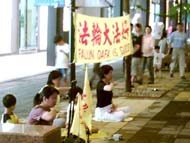 下午三、四点是小学放学的时间,学校外,通常会有大批的家长聚集,等待接他们的小孩。这天我们到附近的兴隆国小,准备炼功洪法,却一直找不到合适的地点,忽然看到学校对面一排商店,其中一扇铁门是关着的,刚好可以挂横幅,场地大小也适合炼功,于是我们去敲了门,出来一位老太太,说明来意后,她很爽快的答应了我们的请求。