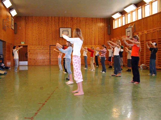 大约两个星期后的一个星期五下午,挪威的法轮功学员再次应邀来到学校。这次学员们将在两节体育课上向七年级的一个班级展示功法。