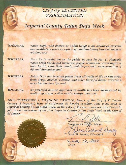 因此,现在,我,加州帝王县艾尔-森绰(El Centro)市市长雷蒙德-卡斯迪罗(Raymond Castillo)特此宣布6月19-26日为艾尔-森绰市的“帝王县法轮大法周”,并号召所有市民一起庆祝艾尔-森绰市的首届“帝王县法轮大法周。”