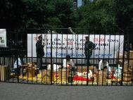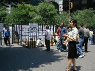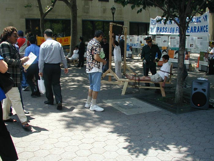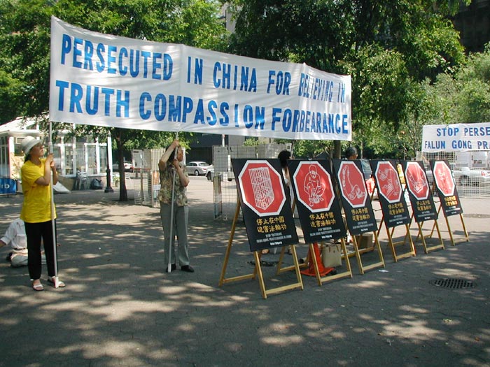 广场位于交通要道,车辆人流来往不断。去联合国上班的工作人员,来参加会议的各界要人,以及各大媒体,很多都要经过这个广场。白底蓝字的横幅“公审江泽民”、“停止迫害法轮功”,以及各式酷刑展板向人们叙述着正在中国发生的邪恶镇压,呼吁善良的人们站出来反对这场迫害。同时,黄底红字的横幅“法轮大法好”和学员的集体炼功溶和在一起,和邻近的酷刑迫害展示形成了鲜明的对比。