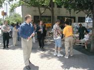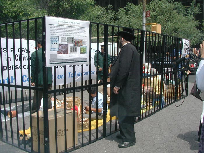 一位犹太男子久久的看着酷刑展和奴工演示,并告诉学员他已签名支持法轮功学员反迫害。