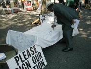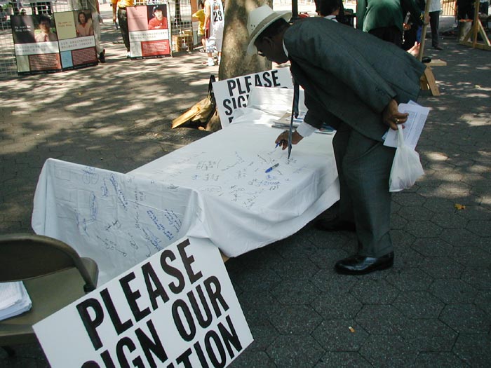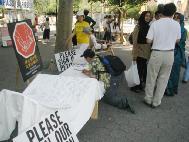 来来往往的行人被眼前的残酷展示所震惊,很多人停下来仔细观看,浏览展板,和学员交谈,很多善良的人纷纷表示同情,询问“我能做些什么。”,签名呼吁“停止迫害法轮功”。