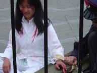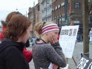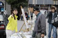 过往的人们纷纷驻足,仔细了解法轮功的真象。在真人展示的酷刑前,在每一块图片展板前,始终聚集着人群。许多人仔细的读着图片说明及发给他们的真象资料,为了看清位置比较低的图片,许多人弯着腰,或者蹲下来看。人们是如此仔细的,急切的想了解,到底为什么在中国发生这样残酷的事情。