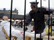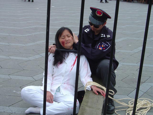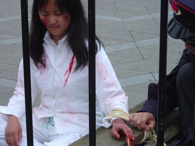 参与扮演酷刑展中受迫害者的学员,有好几位家里有亲人因为炼法轮功而在中国遭受迫害,有的至今还被关押在监狱中,有的被抓后,失去音信。有一位是得法不久的新学员。他曾经饱受身为法轮功学员的父母被抓,一夜之间失去家庭的痛苦,在喜得大法后,他才从家庭灾难的打击中解脱出来。为了让世人了解发生在中国的残酷迫害,他全身心的投入了自己扮演的角色。虽然是夏天,几天大雨后的北欧仍然寒意逼人。他在衣着单薄的情况下,忘记了寒冷,长时间進入大陆法轮功学员被迫害的角色,表演令人震撼。其他参与表演的学员也是用纯净的心克服由于酷刑方式所带来的身体的痛苦,在寒冷中默默承受,长时间在一个姿势下坚持到最后。扮演恶警的学员,克服自己心中的难过,为让世人能体会到酷刑的残酷,他们不断模拟着从网上了解到的恶警残暴的做法。