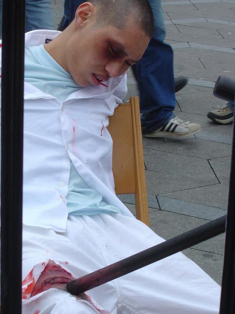由于学员们刚从维也纳欧洲法会回来不久,整个活动的准备工作时间只有几天。学员们在没有经验,时间紧的情况下,却整体配合默契。一位西人学员通过网上资讯,买到了书和材料,短时间就学会了化装技术,做出的伤口形象逼真;瑞典学员在芝加哥法会时就有心向当地学员请教,学会了化装技术,带回了道具。丹麦西人学员利用休假,在短时间内做出了酷刑展的设备与道具,丹麦文、英文专题真象传单。其他学员做横幅、图片到凌晨,默默的相互配合,弥补。
