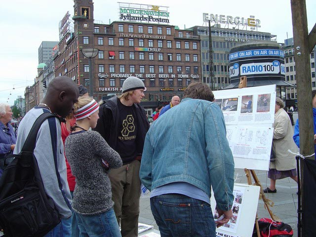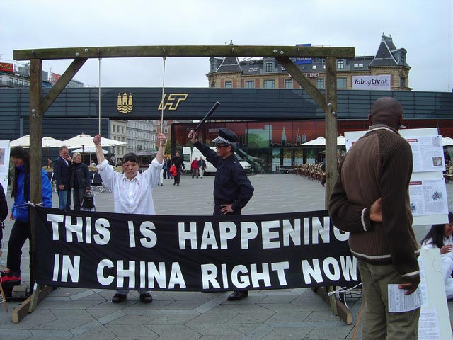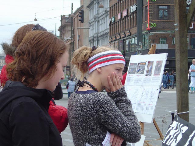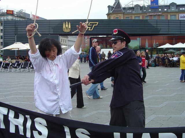 这次的“反酷刑展”由学员亲身展示发生在中国的对法轮功学员進行的酷刑:插竹签,烙刑和吊打,以及大量的图片与说明。与此同时,部份学员進行功法演示,与迫害的场景形成了鲜明对比。现场配有学员用英文,丹麦文通过麦克风向群众介绍发生在中国的这场五年之久的迫害。来自瑞典的学员弹起了吉他,在铜管的伴奏下用歌声呼吁人们一起来结束这场迫害。