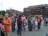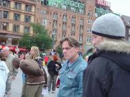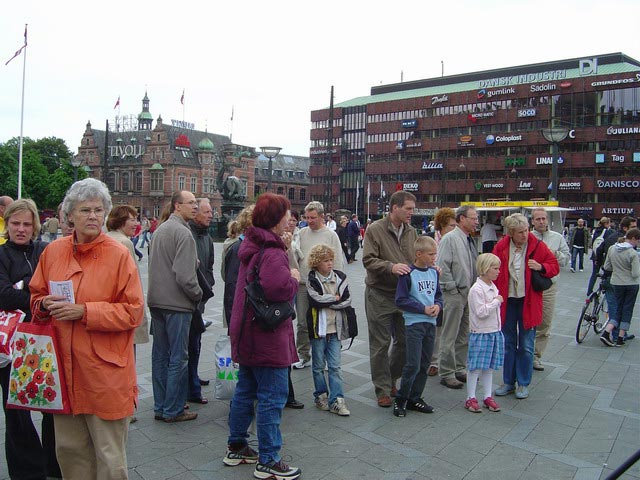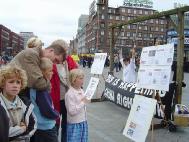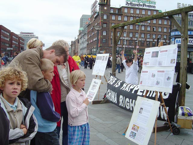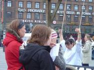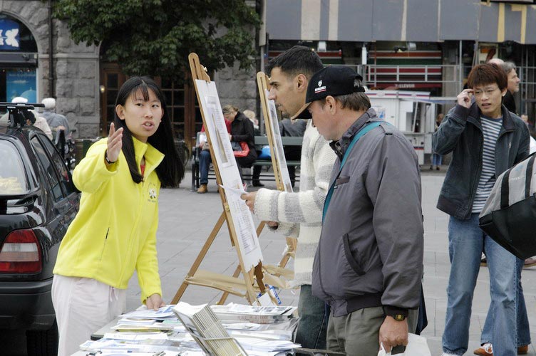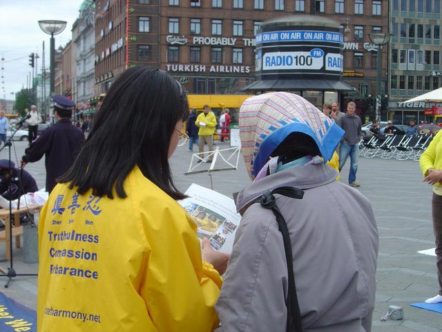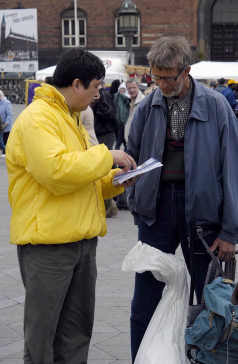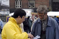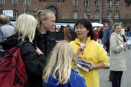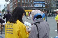 由于时间正值夏季旅游季节,来到哥本哈根的各国游客非常多,人们向学员们索要不同语种的材料。来自中国的游客,也有许多默默的接过真象资料和光盘,许多人在重新思考,认识这场迫害的真实情况,重新再做判断。许多人长时间与学员交谈,或在征签书上签名,或静静的听学员用扩音器讲真象。