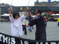 第二天,丹麦大报《政治报》报道了记者在现场对丹麦西人学员的采访,文章不仅介绍了发生在中国的人权迫害,还详尽的介绍了法轮大法的修炼内容及大法网站。一位职业摄影师来到炼功点,交给学员们一张光碟,是他昨天为反酷刑活动所照的照片。