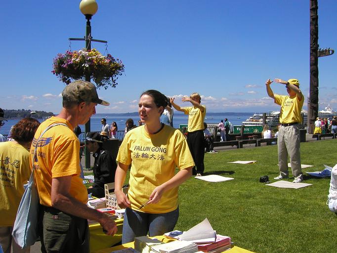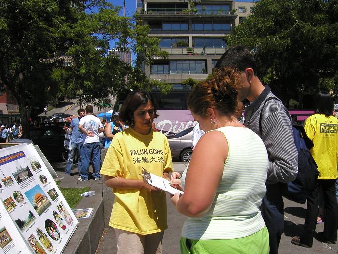 有些华人路过公园,出于对大陆政府的恐惧,有的不愿意签名支持法轮功,但是他们还是很愿意看介绍,并与学员交谈。也许他们明白的一面知道这样了解真象的机会对他们来说很关键吧。