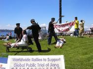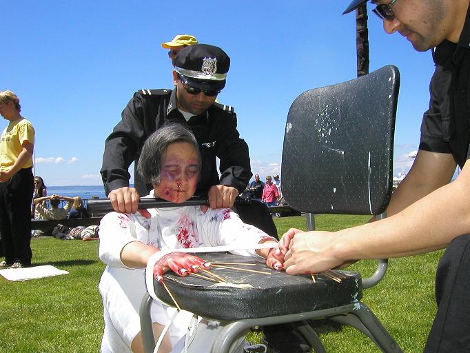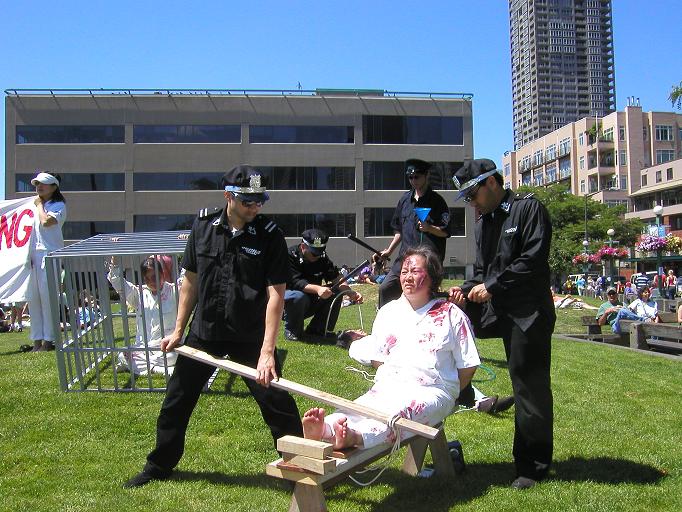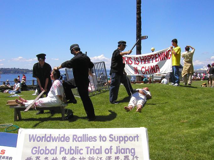今年的“联合国支持酷刑受害者日”正值周末。西雅图市中心Victor Steinbrueck公园迎来了一幕在西方自由社会中难以见到的场景-华盛顿州的法轮功学员在这里举办了反酷刑展。学员们以模拟表演的形式揭露正在中国大陆持续发生的对法轮功学员的残酷迫害。