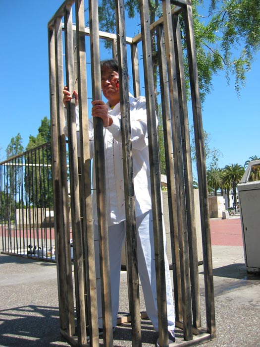 一位演示被关進铁笼子里的女法轮功学员一進笼子,就觉得这儿不是大法弟子呆的地方。她表示,法轮功教导人们按照“真、善、忍”做好人。由于修炼法轮功使人们受益,炼法轮功的人越来越多,引起了江泽民的妒忌,做好人的法轮功学员却被江氏集团关進这样的铁笼子里。