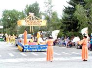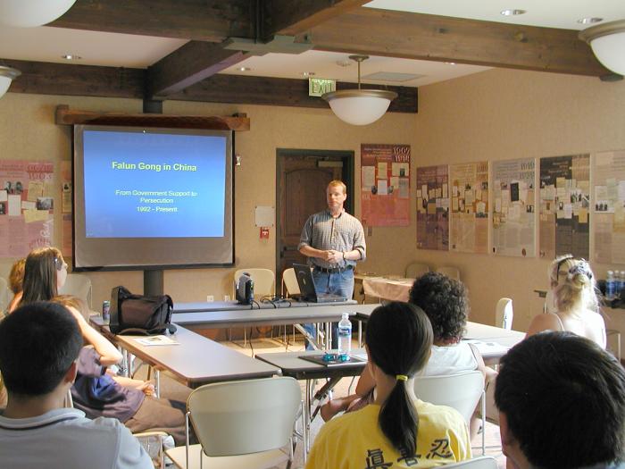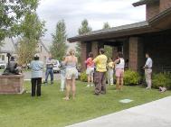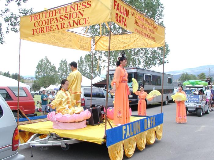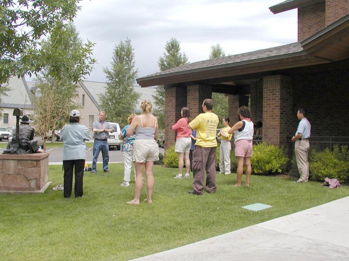 游行后, 学员们在(Eagle) 雄鹰镇的图书馆内教功和介绍了法轮大法, 也向前来学功的人们介绍了法轮大法在中国受到的迫害情况。参加者有老人, 也有小孩, 大家还时不时的提问, 最后, 在圆满的气氛中, 大家在图书馆外的草坪上, 学习了五套法轮大法功法。