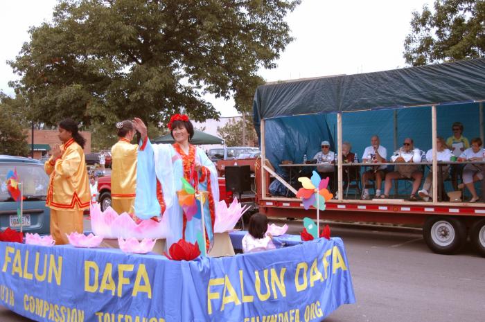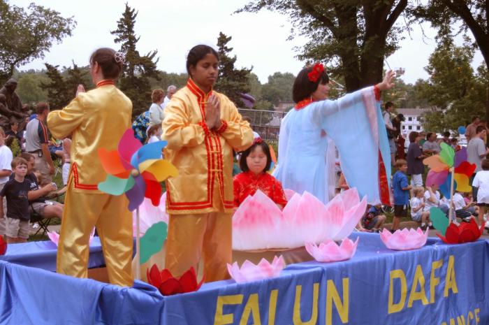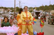 一路上,祥和、庄重的法轮大法音乐,震撼着人们的心灵,学员们装扮的色彩鲜艳的花车,传统的民族服装,学员们认真的功法演示……赢来了观众们的连连称赞声。当学员们经过主席台时,游行的组织者大声宣布:“法轮大法,真善忍,我喜欢,我已经感受到他们的祥和和宁静了,我记得他们去年也参加了我们的游行。这是我们今年的游行中最漂亮的花车,花车上的这些孩子们是世界上最美丽的孩子。孩子们,你们好,谢谢你们!” 观众们也报以热烈的掌声。