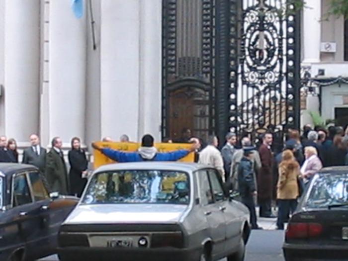 跟薄同车来的阿根廷便衣警察因为有大使馆人站在外面不太敢接受资料,结果后来当大使馆的人不在时,我们过去给资料,全部便衣立刻急不可待的抢着拿资料,这样他们也了解了这几天他们所要“保护”的是什么样的中国官员以及江氏集团迫害法轮功的真象。