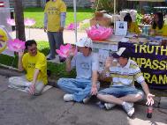 通过这个盛会,很多大小商家、媒体,和政府官员,有机会看到了大法的美好。特别是以商家、政府组织、非政府组织为主的各种游行队伍经过法轮大法的展位时很多司机和表演者都欣然接受了弟子们送上的资料和手工制作的荷花。游行结束后,川流不息的人群在街上走过,很多人驻足观看,主动索要资料,甚至很有兴趣的和弟子们交谈。也有一些人当场学炼功法,和签名呼吁释放李祥春并停止迫害。