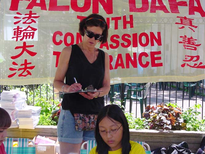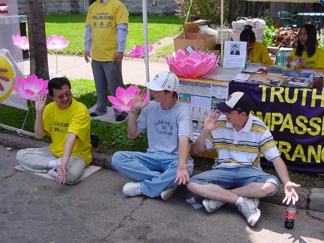 一位两岁的小女孩在法轮功的展位前停留了很久,不断的模仿炼功的动作,最后索性也要在学员演示功法的垫子上表演了起来。她的妈妈看到女儿的天真可爱乐得合不拢嘴。另外一位8、9岁的女孩向一位小弟子学习手工制作荷花,并说要回家后教她的妈妈。有个小男孩儿索要了资料并表示希望自己的妈妈能学习炼功。还有几个小伙子,试着要双盘,虽然没有成功,但他们还是坚持要学第五套功法,十分认真。几个小女孩了解到李祥春的遭遇后认真的签上了自己的名字。