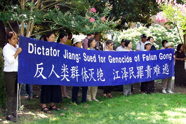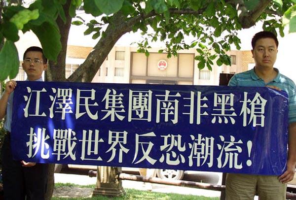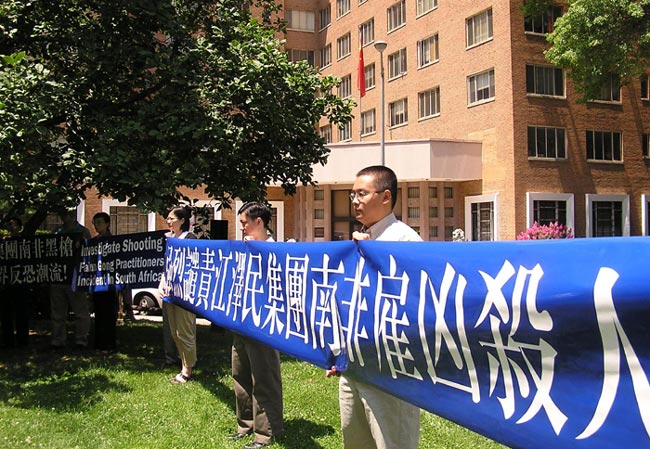 几十名华府法轮功学员在中国驻美大使馆前打出了“强烈谴责江泽民集团南非雇凶杀人”,“江泽民集团南非黑枪挑战世界反恐潮流”,“调查法轮功学员南非遭枪击事件”,“反人类群体灭绝江泽民罪责难逃”等中英文横幅。