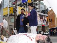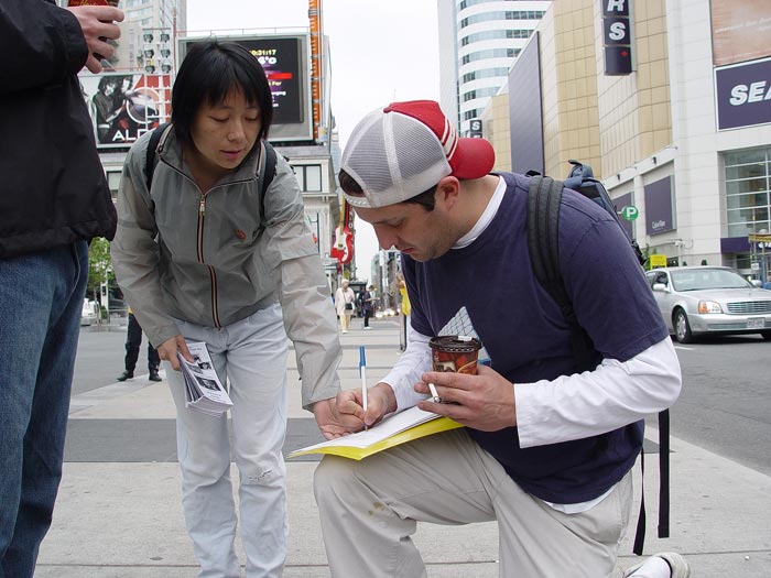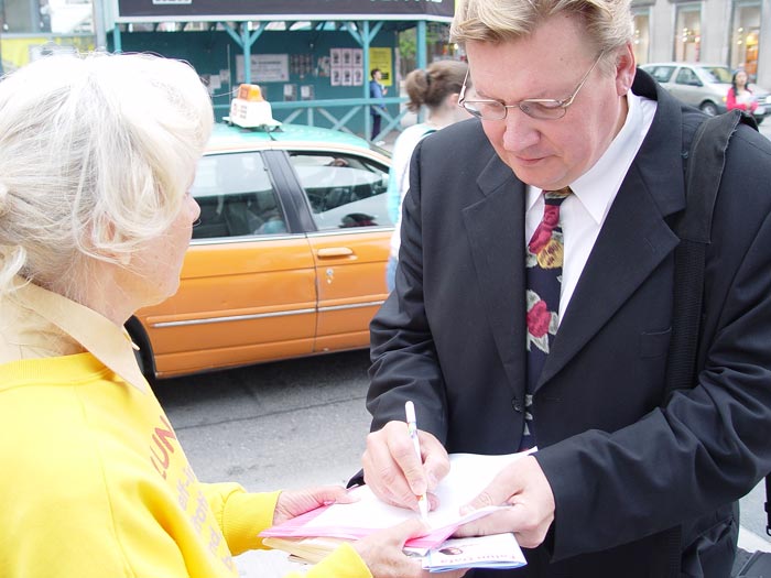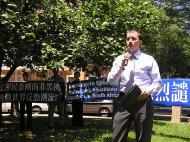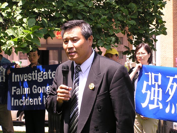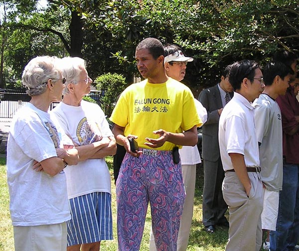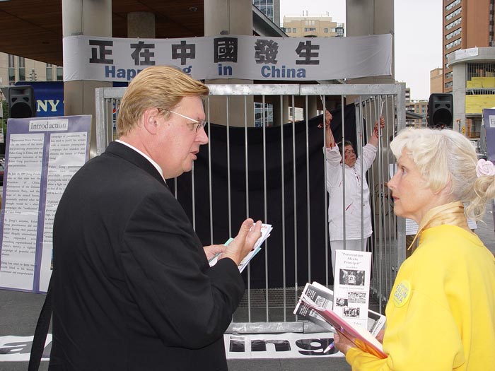 ![]() 美国天主教大学教授聂森博士在发言 | ![]() 西人法轮功学员杰拉德在发言 | ![]() 西人法轮功学员向路人讲真象 |