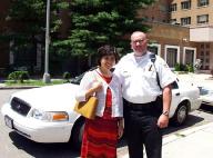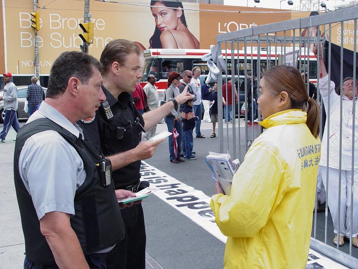 ![]() 法轮功学员同守卫的警察合影 | ![]() 展示江氏集团在海外攻击骚扰法轮功学员的证据 |