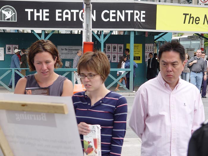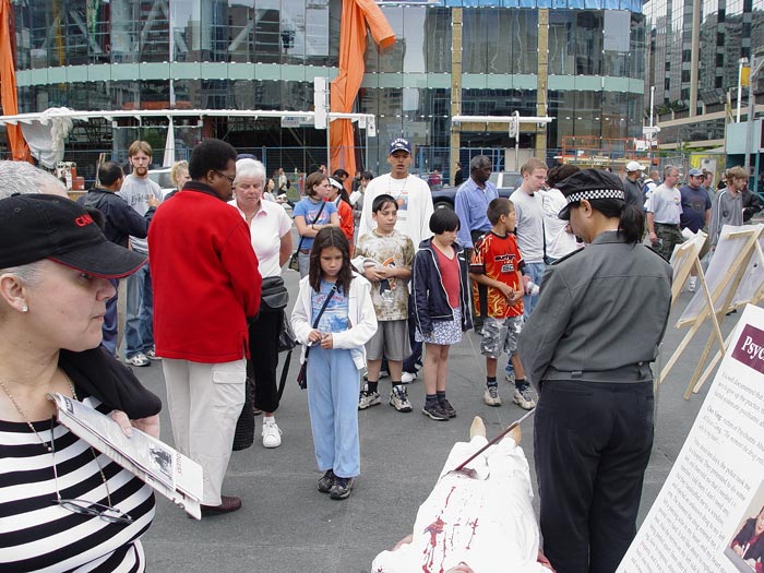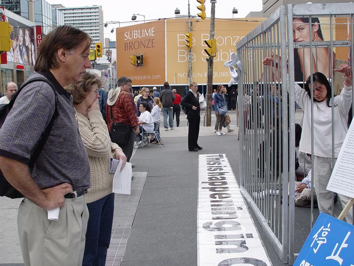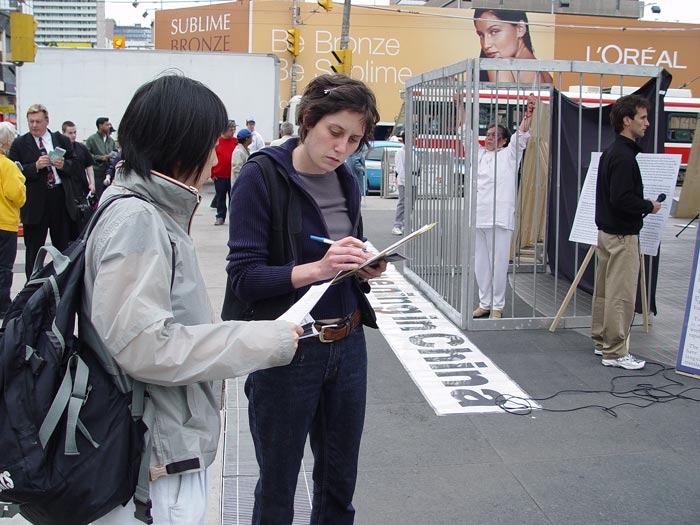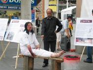 2004年6月26日是联合国支持酷刑受害者日,瑞士法轮功学员在工业重镇巴塞尔市中心举行迫害法轮功图片展,许多行人为江氏集团的暴行而震惊,纷纷在呼吁书上签名。一些来自以色列的游客说要在他们那儿播放真象光盘,让更多的人知道。一位中国小姑娘以前自己学《转法轮》,炼功,但因为不是特别明白,后来也就放下了。今天遇到我们,她问了很多问题,觉得明白多了,她还帮助给路人发材料。