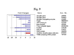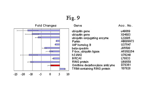 UPP 的主要成份是泛素,UPP系统有三类主要的酶:E1(ubiquitin activating enzyme, 泛素激活酶),E2(ubiquitin conjugating enzyme, 泛素交联酶)和E3(ubiquitin ligase, 泛素连接酶)70。RING(Really Interesting New Gene, 诱人的新基因)RING-finger蛋白质是一组近来才明确其特殊功能的蛋白质[77]。越来越多的研究表明在特定的泛素反应中RING-finger 蛋白质起着主导作用,而且可能所有的RING-finger蛋白质都是E3型泛素-蛋白联结酶[78,79]。我们发现大法修炼者身上分离出的嗜中性白细胞,其泛素、E2和E3的基因表达量有明显的下调控趋势(图9)。在所有我们确认的RING-finger蛋白质中,只有属于RBCC家族的含TRIM 的RING 蛋白质是上调控的[80]。相当有意思的是,有7个泛素E3基因同时下调(图9)。此外,一种与UPP无关的蛋白质降解酶,ornithine decarboxylase antizyme [81],也有显著减少(图10)。UPP系统的下调可能是因新陈代谢率的下降而非打坐入定的直接效应。据报导,泛素是一个紧张或热休克调控的基因[82,83]。不过,目前没有文献报道UPP系统中其它的成分也能随紧张或热休克调控。以下描述的其它与紧张刺激有关的基因的变化也说明UPP体系的下调控可能是个非直接过程。