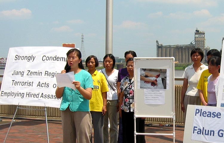 新闻发布会于下午1点在密西西比河畔、圣路易著名的拱门下召开。法轮功学员们打出“强烈谴责江氏集团海外雇凶杀人的恐怖主义行径”标语并宣读了声明。