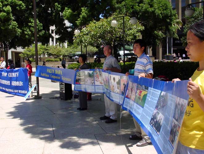新闻发布会于中午十二点半开始举行。法轮功学员首先宣读了一份新闻稿。在新闻稿中,学员扼要介绍了法轮大法在世界各地的洪传概况及法轮大法对社区的贡献,同时详细介绍了6月28日晚在南非发生的江氏集团公然使用黑社会谋杀手段对付和平理性的法轮功学员的国家恐怖主义行为。最后,圣地亚哥法轮功学员强烈谴责江氏集团把国家恐怖主义扩展到海外,并呼吁世界各国政府,民间组织及一切善良的人们共同起来阻止暴行。