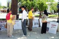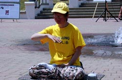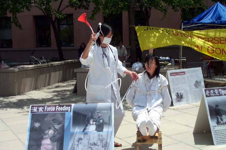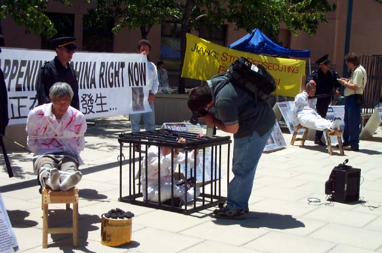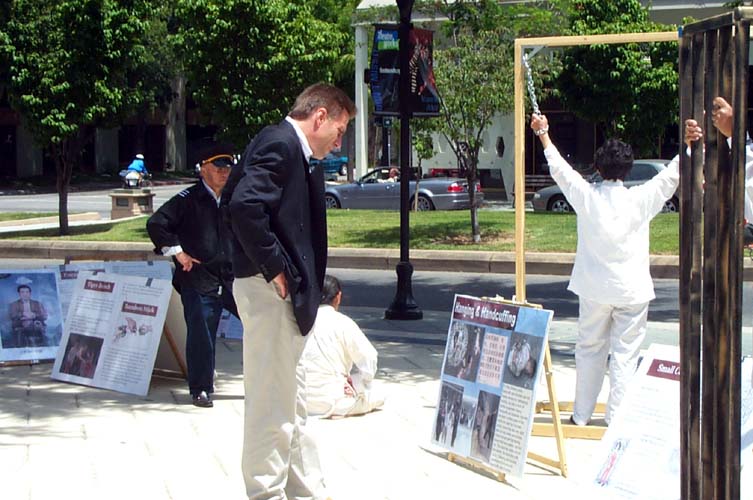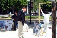 在凝重的音乐声中,学员们演示着被吊打、坐老虎凳、被插竹签、折磨性灌食、被强行堕胎、关铁笼子等,把千千万万中国大陆的法轮功学员受到的残酷迫害的现实,活生生的展示在人们的面前。还有部分学员在酷刑展旁演示功法。很多路人仔细的观看每一个酷刑和图解,有的表示这么好的功法,不应受到残酷的迫害。有的与学员交谈了解更多真象,