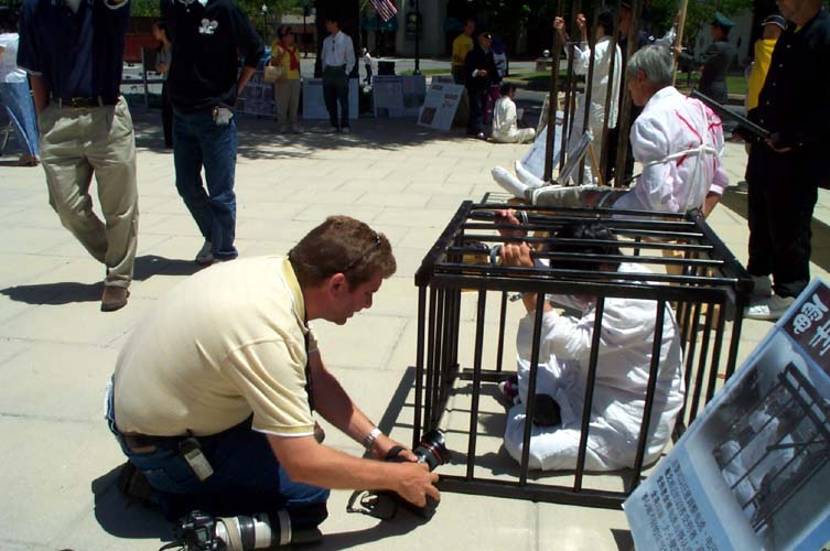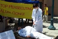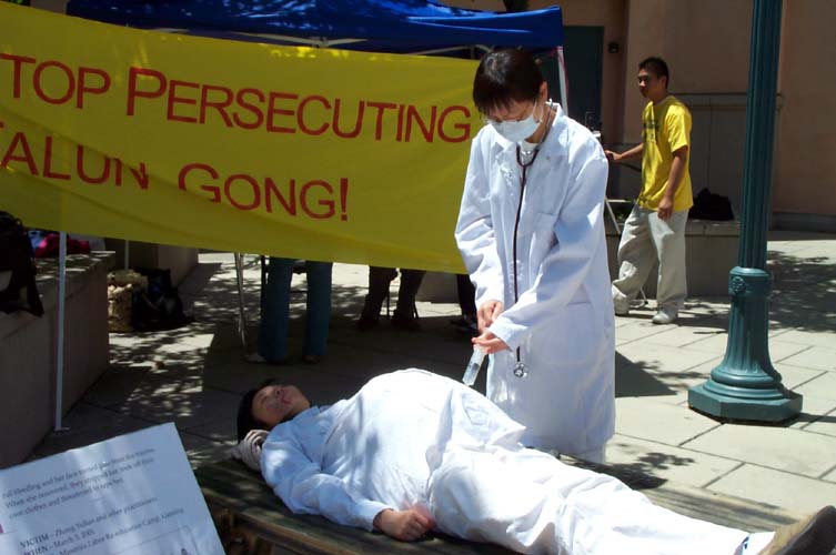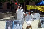 印第安纳普度解说报(Purdue Exponent)7月7日报道,一位亚洲人躺着,被绑在一张桌子上,他的前额因午日的阳光而闪烁着汗水,白色的衣服上溅着晒干的红色物质。一道伤痕画在他的太阳穴上。除了胸部随着呼吸微微的上下移动外,他一动不动,此时此刻他成为在中国法轮功受迫害的一个活生生的展示。
