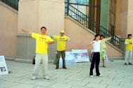 过往路人有的认真阅读学员分发的传单,有的仔细阅读展板上学员受迫害的事例,有的观看学员炼功的祥和场面。