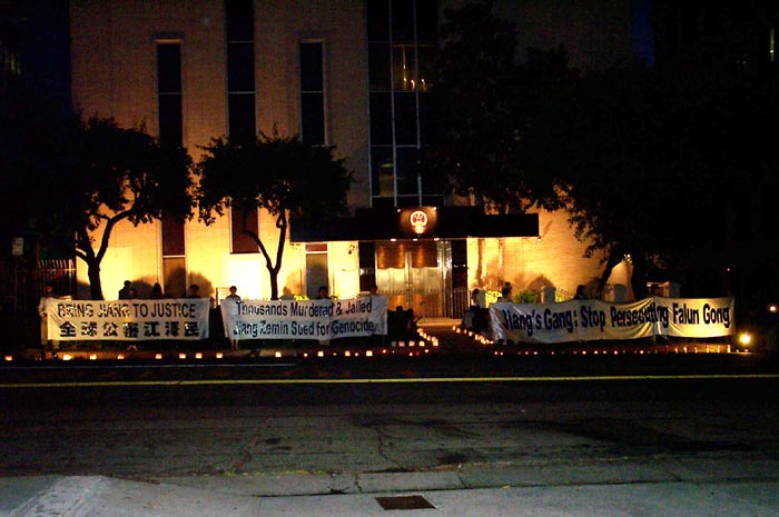 法轮功以来,已经有至少1000名法轮功学员被证实迫害致死。洛杉矶法轮功学员7月8日晚在洛杉矶中领馆前举行烛光悼念活动,纪念在被迫害致死的同修,谴责江氏集团的暴行。