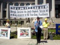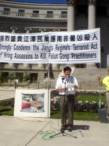 科罗拉多大学丹佛校区的法轮功之友也派代表在会上发言,强烈谴责在南非发生的雇凶枪杀法轮功学员的恐怖行为。他指出种种迹象表明此恐怖行动是江氏集团所为,并要求南非政府尽快调查和公布真象。