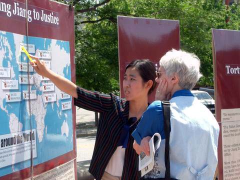 一位白人女士看了酷刑展后,极为震惊和感动,主动提出帮助。她告诉学员她所在的教会隶属于一个全国性的人权组织,她会帮助我们与他们取得联系,并能够与其合作以制止中国对法轮功的迫害。走之前,她还向学员们要了很多真象资料,要到她所属的教会去发给其他人看。