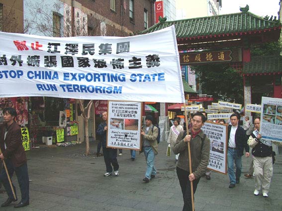集会于下午1时左右开始,从南非回来的澳籍公民代表、全球反对中共输出国家恐怖主义大联盟、全球审江大联盟、追查迫害法轮功国际组织、社会民主人士等在集会上发表了讲话。法轮功学员的酷刑演示同时進行。2时左右,游行队伍从Sydney Town Hall出发,经市中心主要繁华商业街,到达华埠唐人街,各团体又于唐人街再次发表演讲。