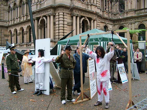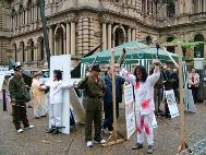 法轮功学员是和平理性的,面对无理的镇压与不公,他们心怀坦荡、真诚的告诉身边的人法轮功的真象,他们没有使用过暴力和极端的行为来抗争残酷的迫害。他们身处逆境,却并不麻木颓废,他们以坚韧的意志承受无名苦难,愈加坚定的用实际行动向世人展现着法轮大法的美好。到目前为止,经证实的已有1001名法轮功学员被迫害致死。绝大多数的学员死于残暴的酷刑折磨。为了更直接的让澳洲市民认清江氏集团迫害法轮功使用的邪恶手段,法轮功学员在Town Hall同时举行了酷刑展。