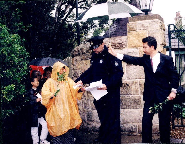 请愿的民众大部分是澳洲的公民,也同时是法轮功学员。他们平和的捧着鲜花和信件从悉尼情人港步行和乘车而来。总理府邸前,他们静静的站成一排。澳洲的冬季寒冷萧瑟,此时,又下起大雨。风雨中他们默默的静立着,没有一个人离开,他们真诚的希望澳洲政府和所有善良的人们为了澳洲的祥和安宁、为了人类的美好共同谴责江氏集团在南非枪击法轮功学员的恐怖主义行为并制止其在世界蔓延。