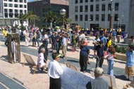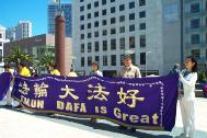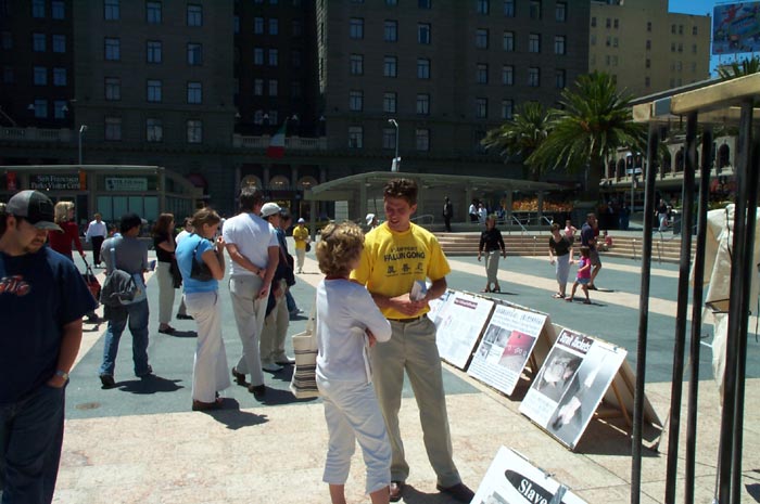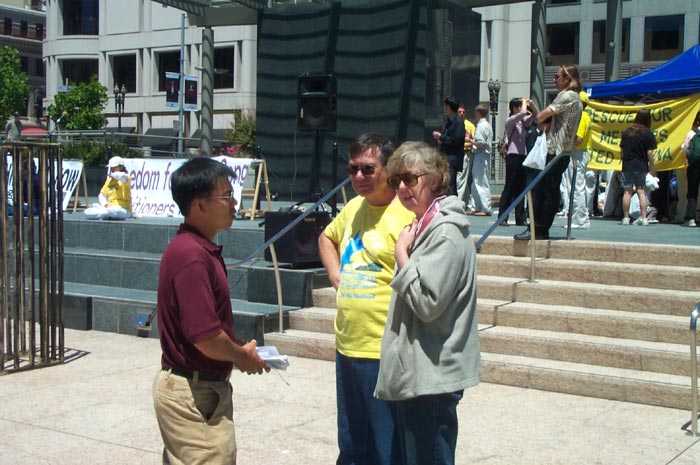 值得一提的是,有一位叫Bob的西方人,是在三个星期前,当湾区学员在加州首府举行酷刑展时,他觉得能量场很好,就学了功,还参加了两整天的活动。这次他跟随加州首府的学员,驱车两个半小时来到旧金山参加活动,并积极的派发真象资料和讲真象。他表示很自豪能参加活动。