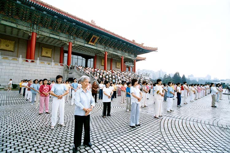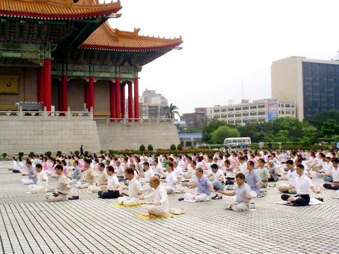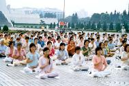 ![]() 功法表演时,场外的法轮功学员及部分民众也开始一起炼功 | ![]() 法轮功学员们的动作整齐,场上祥和 | ![]() 国际偶戏节开幕的第一个节目--法轮功功法表演 |