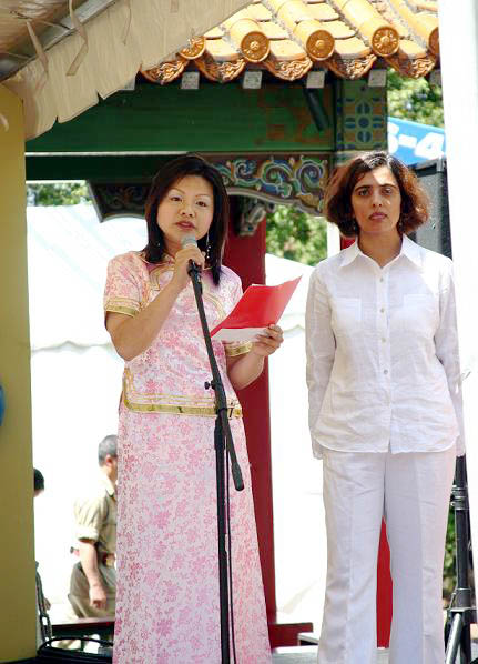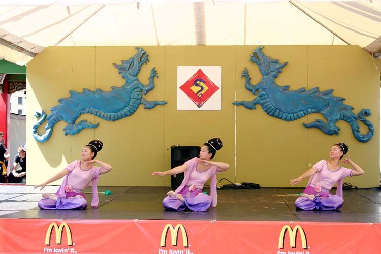 夏日庆典中的一大聚焦点是各团体的民族表演。中国城庆喜公园以“龙的舞台”的面貌出现,两天中精彩节目连连。而大法弟子表演的一台高雅、柔美的中国传统舞蹈“花仙”倾倒了在场观众。舞蹈前,两位弟子分别用英文和广东话介绍了大法在世界的弘传、在中国发生的镇压,和舞蹈所表达的修炼人的善良和美丽。音乐响起,3位女学员翩翩起舞。此时,阳光撒向舞台和观众席,人们仿佛沉浸在仙境中,沉静在大法给世间带来的无限美好之中。